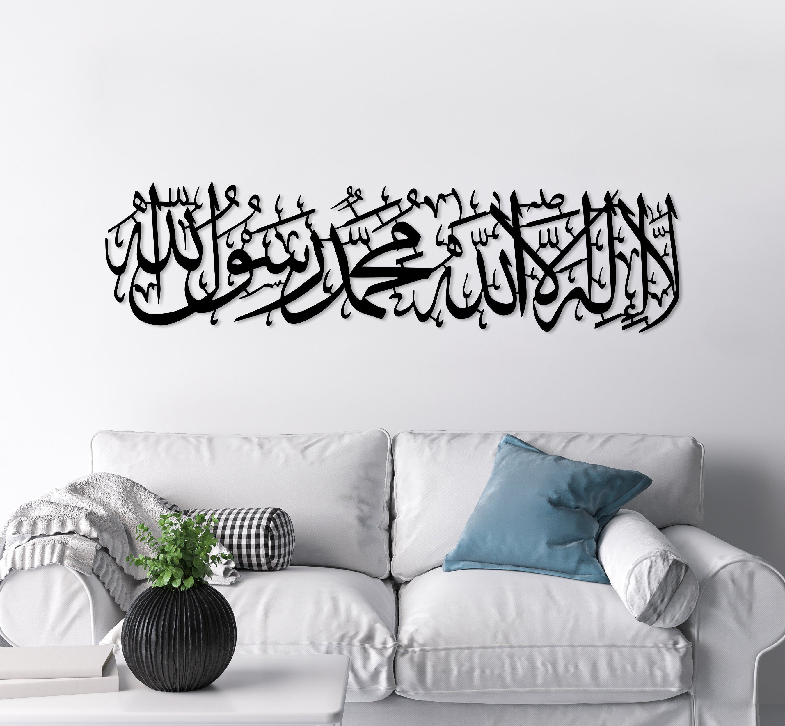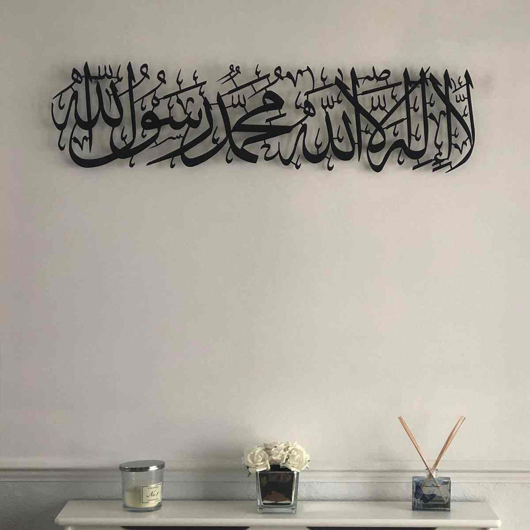 This wall decor, adorned with the First Kalima "There is no god but Allah, and Muhammad is His messenger" in horizontal Islamic calligraphy, symbolizes both unity and eternity in Islamic culture. Ideal for Ramadan Decor, Eid Mubarak, or as a thoughtful Muslim gift, it enhances home decor with its beautiful Islamic design. See other Islamic Wall Decors by clicking here!